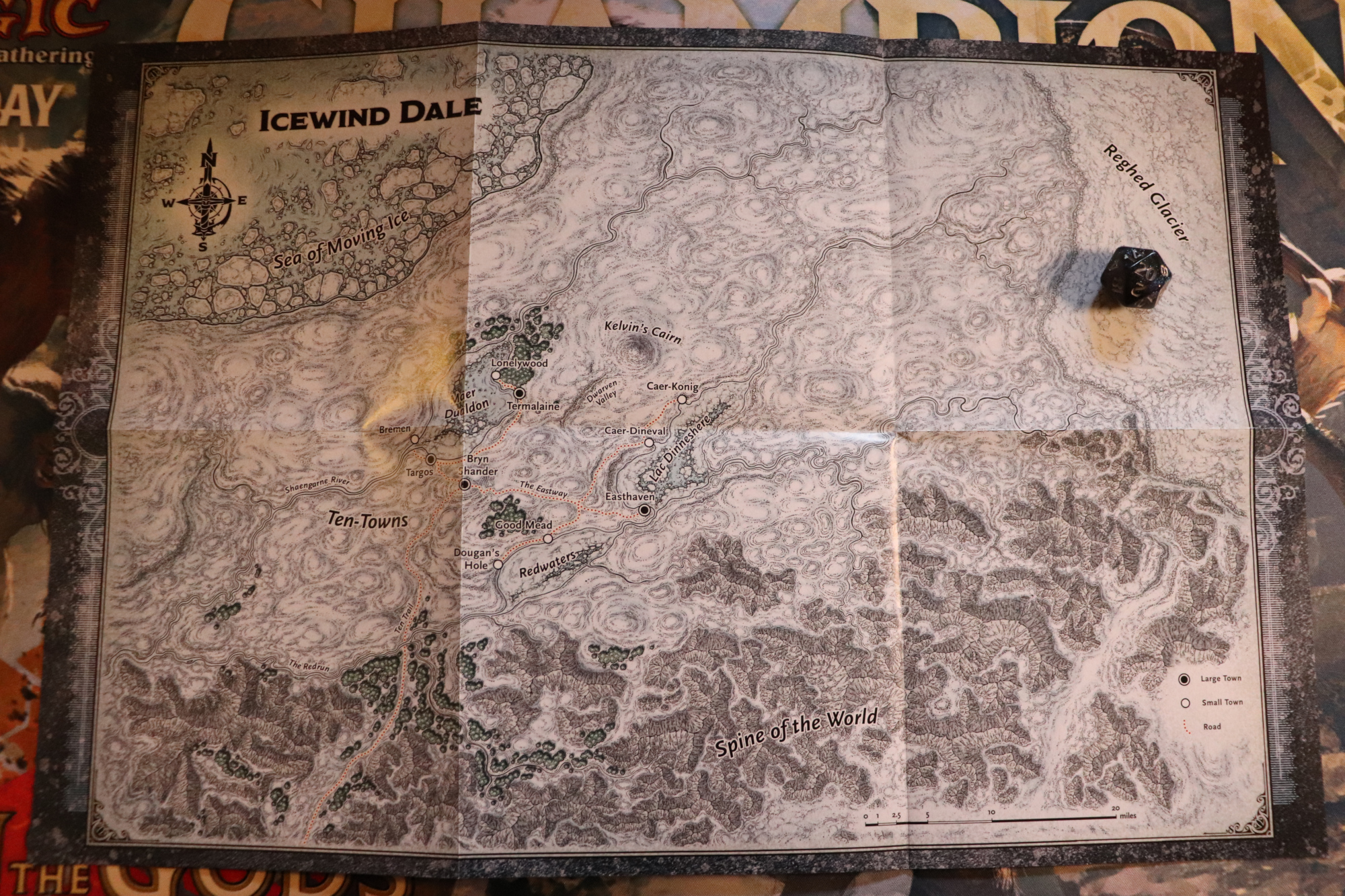 Of course, we also get a double-sided map. Its dimensions are 39.9cm x 26.6xm (also known as 15.6” x 10.4”) and, this time, it features a general map of Icewind Dale on one side and maps of Ten-Towns on the other.