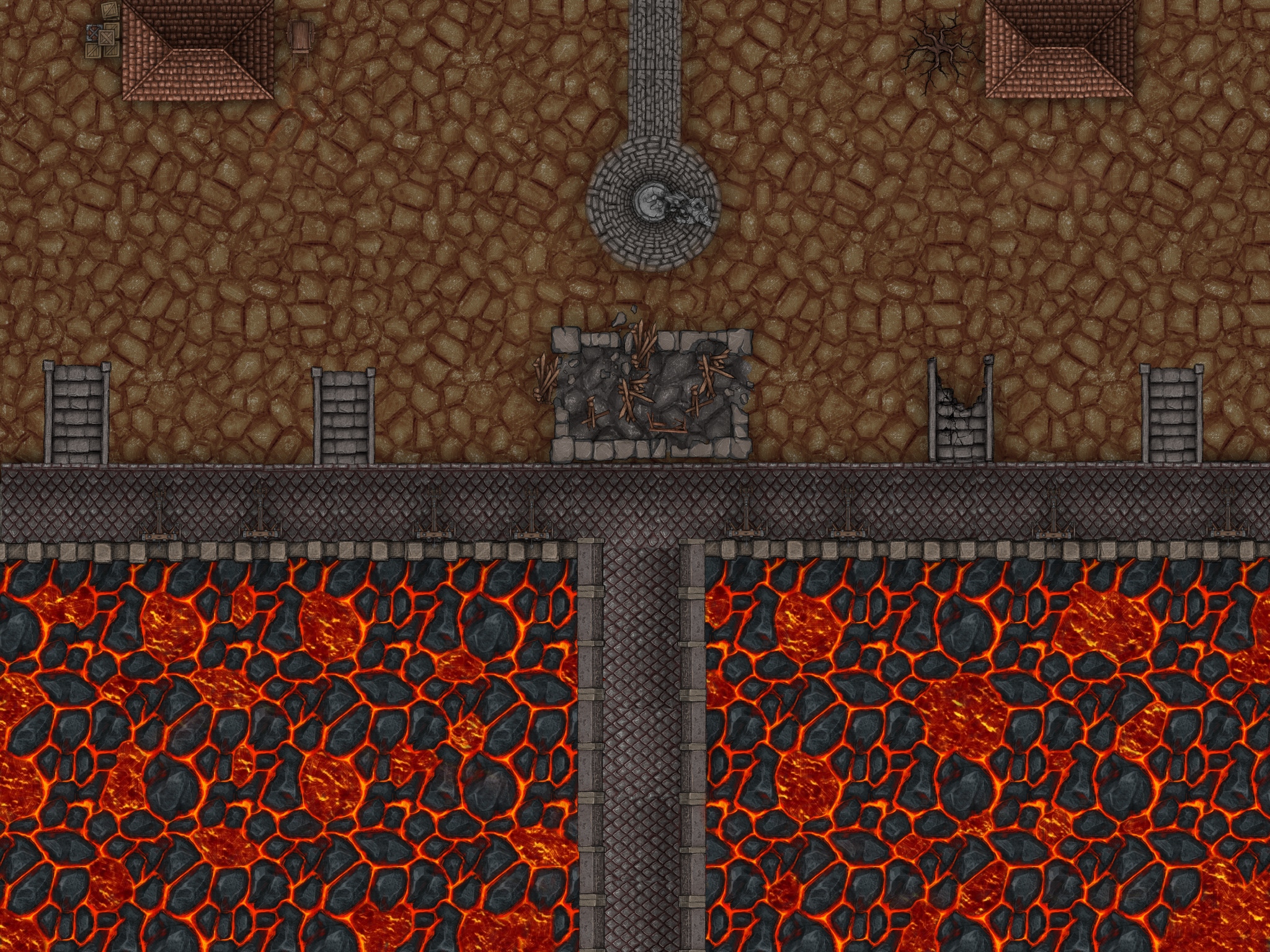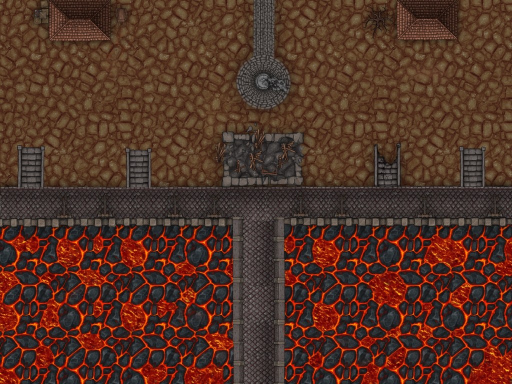 This is an outpost that guards a passage through a river of lava. It protects the bridge and the start of a trade route from both bandits and creatures that dwell in the lava river. The kingdom is slowly failing and that can be seen here. It is a very important pass since only a few exist because it connects some key points of the kingdom that provide valuable resources. However, it’s falling into disrepair, after the amount of attacks has been slowly rising. The outpost used to be bigger and livelier. Now it has been reduced to a barracks and a trading post that acts as a small inn.