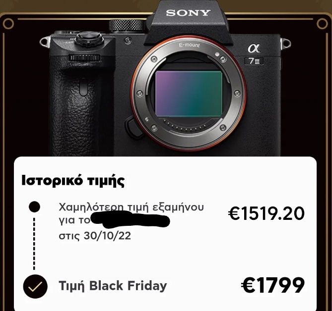 But an even funnier picture is this one. This is not from a price checking website. This is from a vendor’s website. A month ago the price was 1519 euros. But just for Black Friday, we have the opportunity to acquire this nice looking camera for the exclusive price of 1799 euros. Of course, when the vendor realised their critical failure, they disabled the ability to check the price history of items on sale.