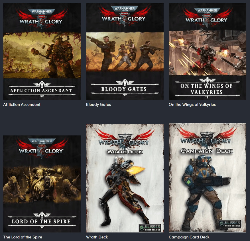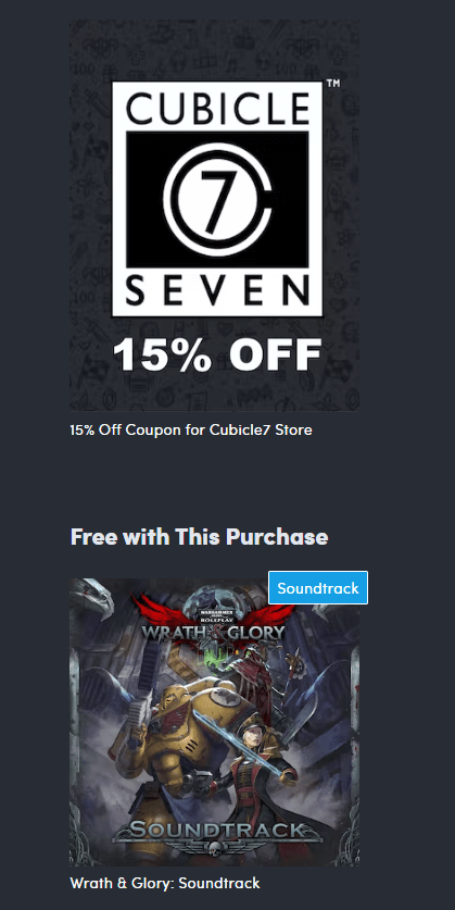 Wrath & Glory has assets to enhance your Warhammer 40,000 adventures: from the core rulebook to the gm’s screen and various card decks that make your games run smoothly while providing information and various elements to your game. There’s also a 15% off coupon for the Cubicle7 store.
