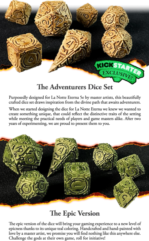 Adventurous players looking to explore exciting new content can take a sneak peek of some of the material available on the Kickstarter. Did I mention that there are awesome dice included?