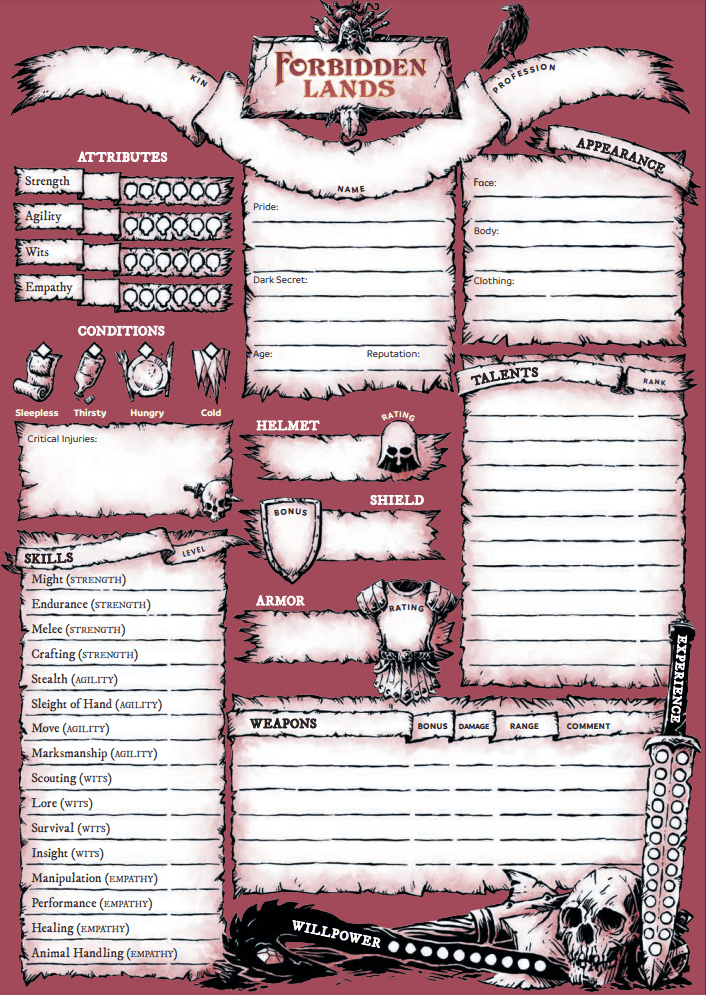 I am not sure how forgiving on the eyes it is, but I love the art that is incorporated on the character sheet. And this is just the first page. You can check out the rest on the downloads page of the Free League Publishing website.