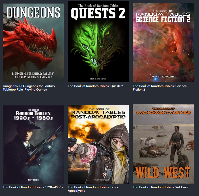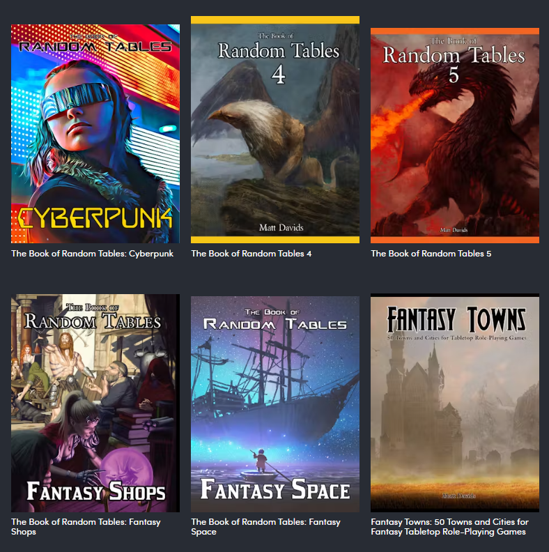 There are also numerous books of random tables here covering everything from quests, encounters and dungeons to specific themes like space, horror, and cyberpunk. These are excellent resources for beginners too, providing them with everything they need to take their first steps in the gamemaster’s journey without feeling overwhelmed.