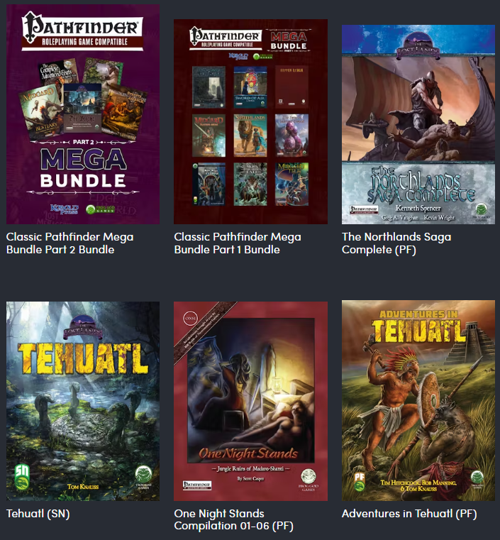 Megadungeon Megabundle – 84 items with dungeons, rulebooks, a 500-page campaign, and for a limited time two physical copies: Dungeon Crawl Classics #67 Sailors on the Starless & Fifth Edition Fantasy #26 Against the Thieves Guild. Don’t forget the 20% discount coupon for your next purchase on goodman-games.com. Ends around April 2nd for about €17.23.