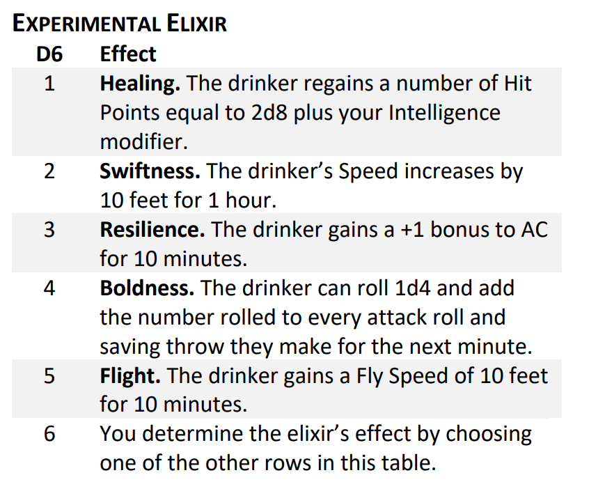 On that note, you can also create 1 additional elixir by spending a spell slot, and this time, you do get to pick the effect. But you get 1 elixir regardless of the level of the spell slot. I don’t expect this to see much use though, because here comes the second big problem with the elixirs: they don’t really scale as you level up. The healing one scales with your Intelligence, but that doesn’t really count. At level 10 let’s say, you really expect something more impactful than a 2d8 healing. I will admit that some of the effects are harder to scale, specifically Resilience and perhaps Boldness too, but the other 3 could easily get some number increases along the way.