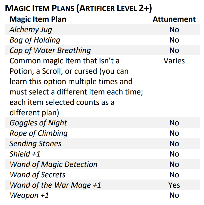 You can now also create artisan’s tools when using Magical Tinkering. Quite a niche application, really, but it does fit the theme, and while you probably won’t use it too often, since I expect most players to carry any tools they are proficient with, I suppose there are cases that this would come in handy. This is pretty much the same as it was in 5e, but now it takes an action instead of an hour.