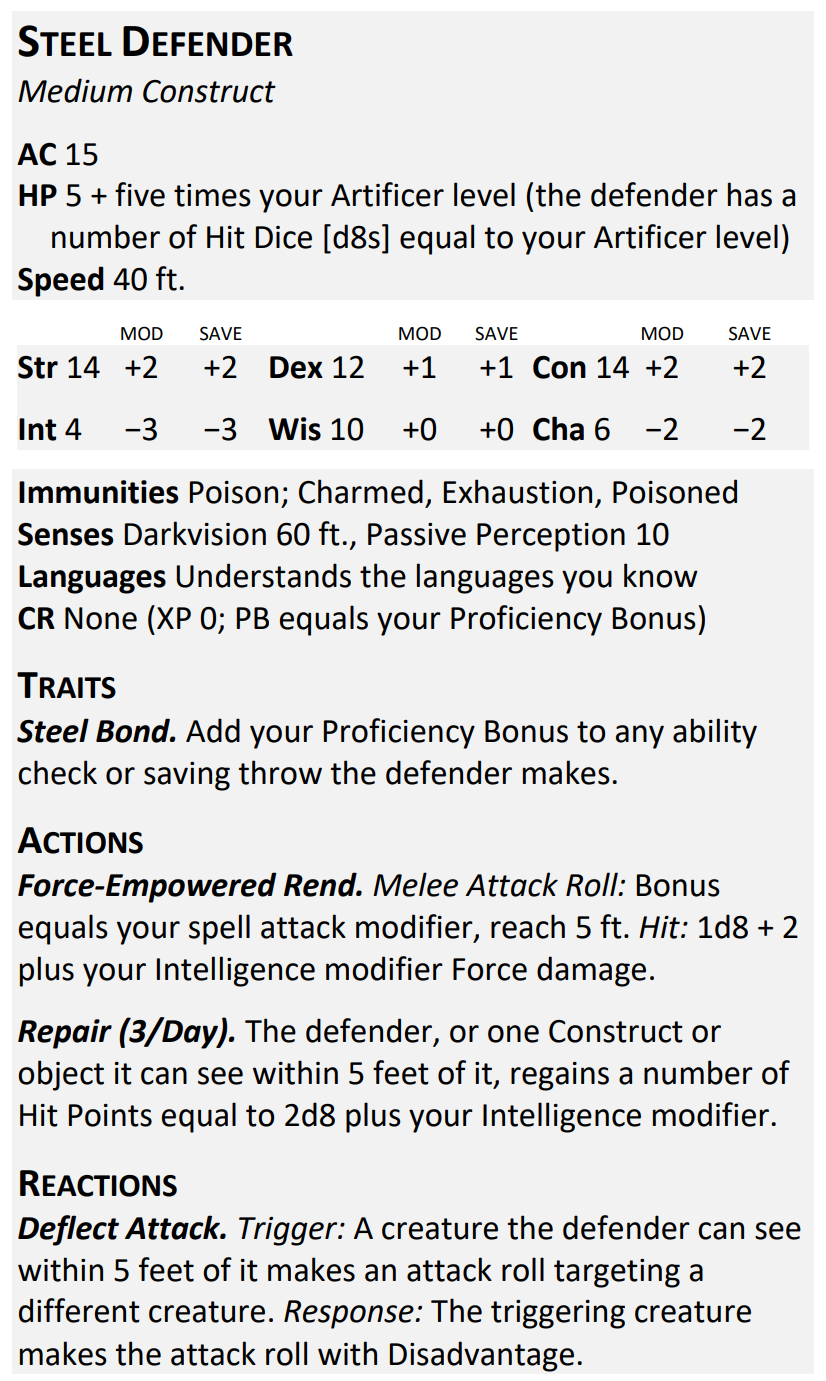 And speaking of the Steel Defender, here it is. You can make one once per long rest, or, if it has died within the last hour, touch it and use an action to bring it back after 1 minute. It can move and use reactions on its own, but you must use your bonus action to order it to do stuff other than Dodge – pretty standard stuff.