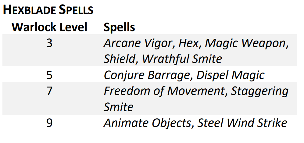 Yes, yes, you get your extra prepared spells. Some changes from 5e – now you have Magic Weapon, Shield, Freedom of Movement and more – you lose Blink though, Cone of Cold, Blur… In general, you get more “martial” spells, if that makes sense. You also get Hex as permanently prepared – because, just like the ranger we saw with Hunter’s Mark, the entire subclass revolves around it. So don’t count on concentration either, that’s locked down.