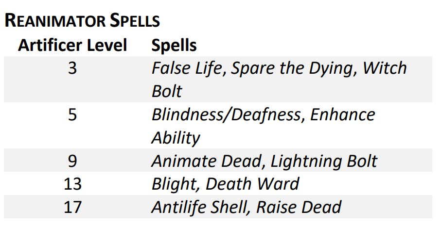 The core of the class… and for me, a disappointment. I’m always hesitant about subclasses that rely on summons, companions, et cetera – and in this case, artificer already has the Battle Smith with its Steel Defender. If you remember the last UA Analysis, I was critical of it then, and I feel the Reanimated Companion is worse than the Steel Defender.