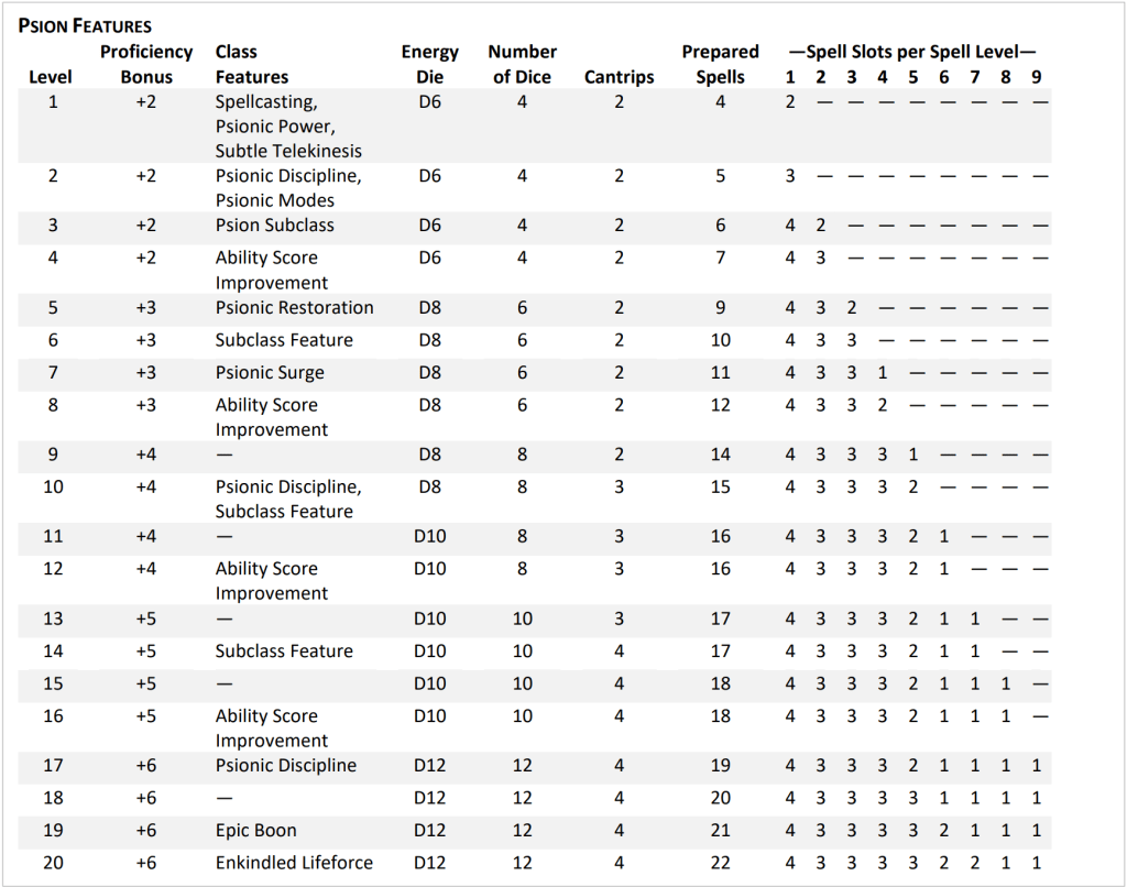 Psionics are making their way to the 2024 edition, with the Psion. It had a… turbulent time in 5e, with various versions of the Mystic appearing here and there in a couple of UAs, but it was never officially released in a supplement. They were using Psi Points (kinda like the Monk’s Ki Points) for their Disciplines, and each Discipline gave a bunch of actions, with some of them having varied psi point costs, and… in general, it was a bit too much, if not all over the place. The class itself was scrapped, and psionics found their way into other classes such as the Soul Knife Rogue, the Aberrant Sorcerer, and the Psi Warrior Fighter (who are also present in v2024, in the PHB). Now, however, it’s much tighter and a lot more focused, so let’s see what we’ve got – though considering just how different the class is, I’m not really going to talk much about comparisons with 5e. As usual, you can also watch the related YouTube video from the official Dungeons & Dragons account.