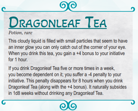 In Chaispace, tea is not just part of the culture, it’s magic, and Dragonleaf Tea is at the heart of the system. The secrets behind the cultivation and preparation of this addictive brew are known by tasseomancer wizards, who use it to enhance their focus and power. (De)Caffeinated is the state(s) a Tasseomancer enters when they have either drunk plenty of tea or not enough (god help us), and that affects their initiative rolls.