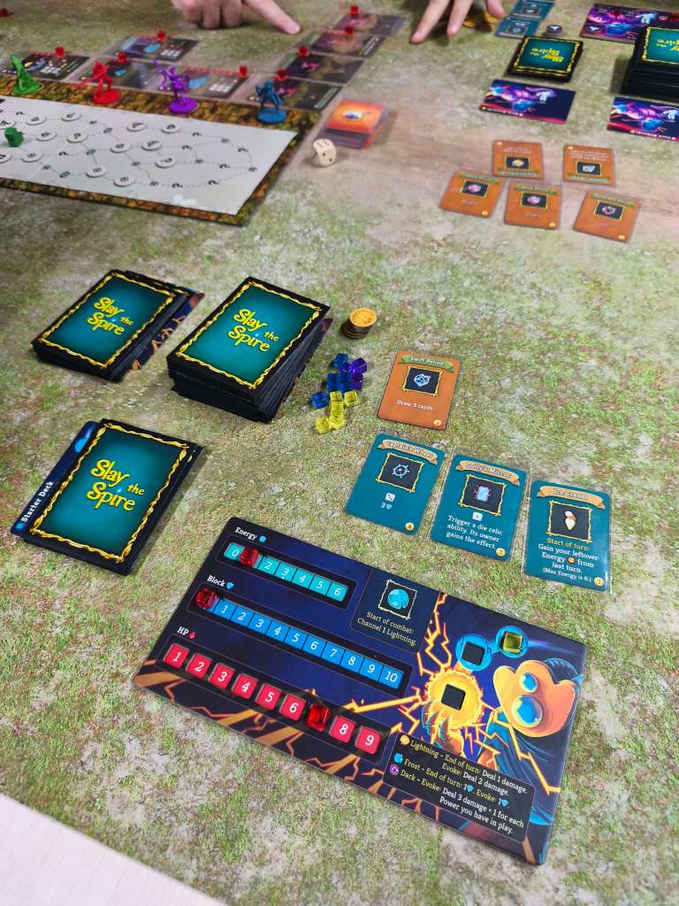 Finally, a general deckbuilding hint is – don’t bloat your deck too much. If you get 3 duds in one of your card rewards, remember that you’re not obligated to take one – skip them and move on. Though I will note that, at least personally, I’m not as picky in the board game as I am in the videogame – sure, you still want to remove the basic Strikes and Defends, but I usually find myself picking up a card reward at least 90% of the time, even late into Act 3. I think a big part of it is that your options are also a lot fewer, in a sense – the pool of cards is limited, there are only a handful of duplicates, so you can’t really build a broken, super-combo deck. In addition, many effects (especially relics) that were central to some decks in the video game, or could trigger repeatedly, now happen only once per turn. No more Corruption+Dead Branch, no more Spinning Top, no more getting 100 energy and then Multi-Cast evoking a lightning orb with the Defect. So if you’re coming into this with several hundred hours in Slay the Spire and your first instinct is to concentrate your deck to a tiny handful of combo cards – you’re probably going to fail, at least at first.