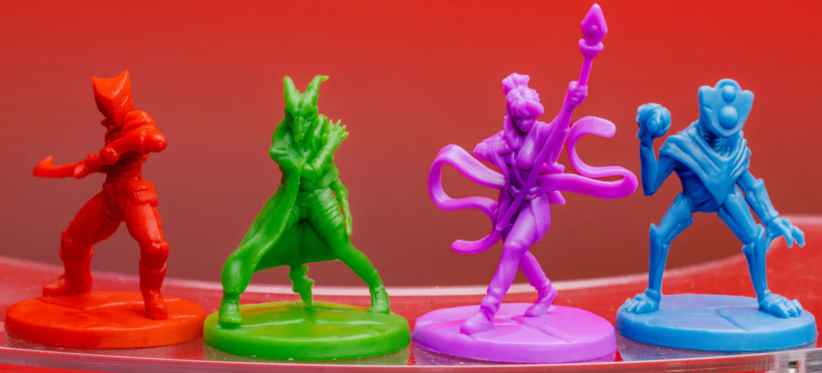 - 4 plastic minifigures, one for each character. They are all one flat color, with each character having a different one – red for the Ironclad, green for the Silent, blue for the Defect and purple for the Watcher. I don’t mind the flat color; I think it’s a good decision to make them easy to recognize, even though they all have very distinctive shapes; especially for newer players, and doubly so because there’s a lot of stuff being set up on the table, so seeing where your character is with just a glance is a big bonus.