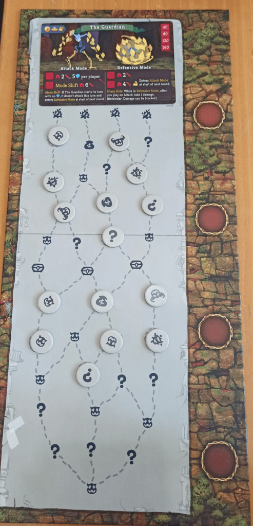 Now, once you’ve stepped in a room with an Encounter, combat begins. Each player places their character figure in one of the 4 slots on the board – the circles you can see on the right side. Then, for each player, draw a card from the Encounter deck and place them in a row. Some enemies have Summons; they are indicated on the bottom of their card, and you search for them in the Summons card and place them next. Put some cubes to track their HP, and you’re ready to fight. Page 10 of the Rulebook has some very simple and nice diagrams of how exactly this works.