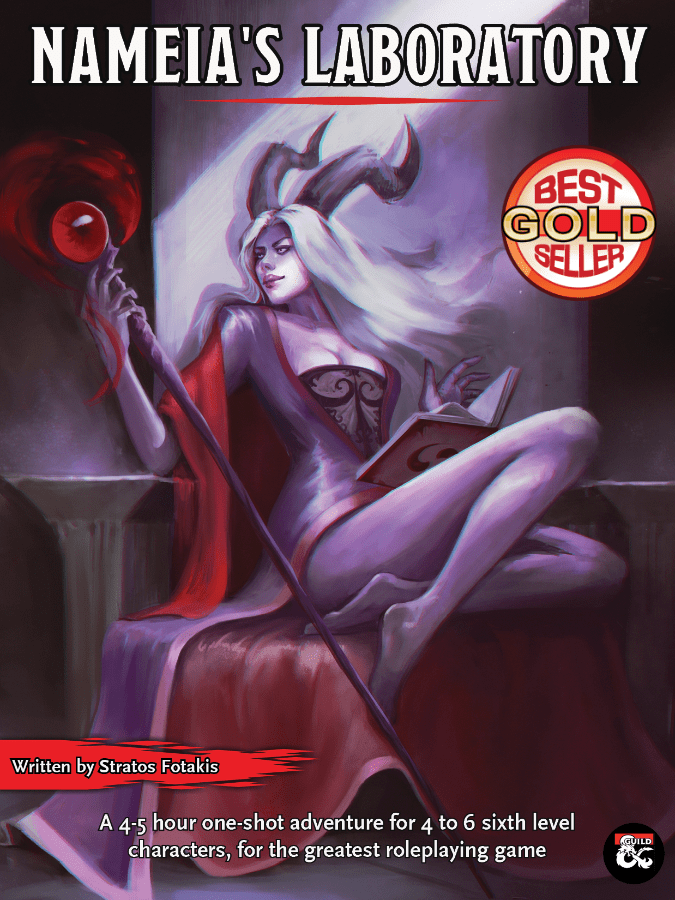 Nameia’s Laboratory is a one-shot adventure created by Stratos Fotakis and illustrated by Alexandros Balatsouras. It is designed for parties of 4-6 players and 6th-level characters(more on that later), with an average duration of 4 to 5 hours. It’s always pleasant to see Greek creators contributing to the community. So let’s see what’s bleeding inside.