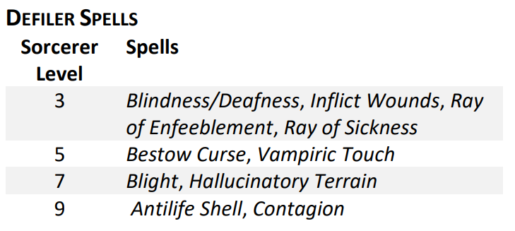 The usuals – nothing unexpected here, all the dark/scary/defile-y spells you’d expect.