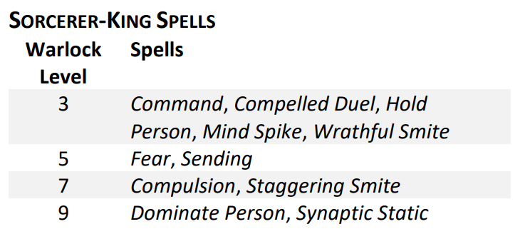 A Sorcerer-King sounds like just a powerful mortal, so I wasn’t sure why a Warlock would make a pact with one, but I have to admit the description is a bit more… hype, I guess you could say: “Your pact draws from the power of a monstrous, tyrannical force akin to a demigod or an overwhelmingly powerful magic-user. Through your pact, you herald this tyrant’s interests in the world, channelling their influence and mind-bending, psionic power.” Though the last-minute mention of psionics kinda threw me off, I assumed this was more Arcane magic than Psionic from the word “Sorcerer”. Anyway, let’s take a look.