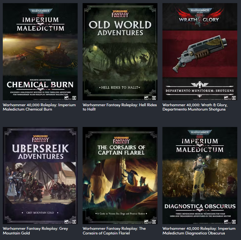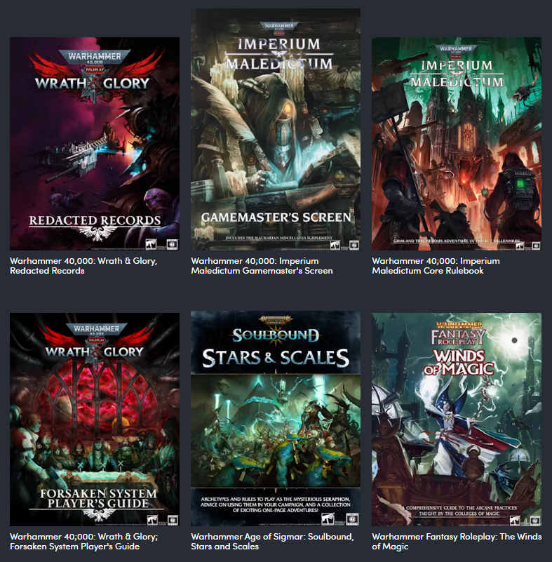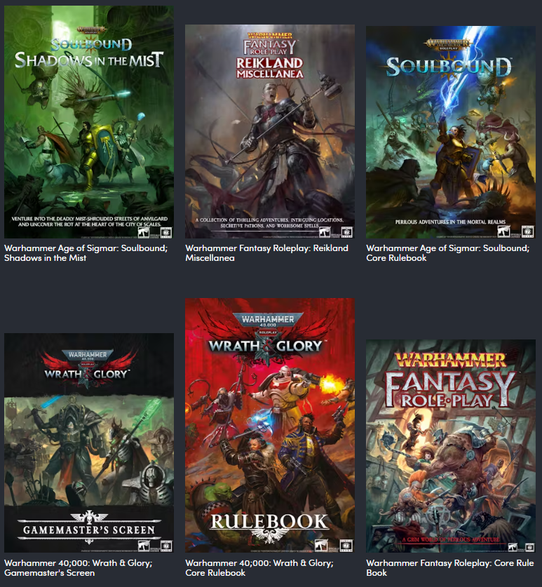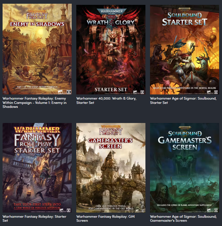 - Warhammer Age of Sigmar: Soulbound Gamemaster’s Screen, Wrath & Glory – Gamemaster’s Screen, Warhammer Fantasy Roleplay Gamemaster’s Screen, Warhammer 40.000: Imperium Maledictum