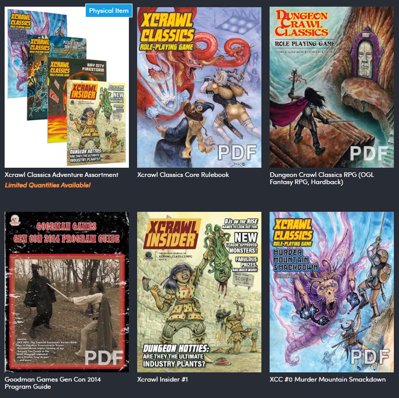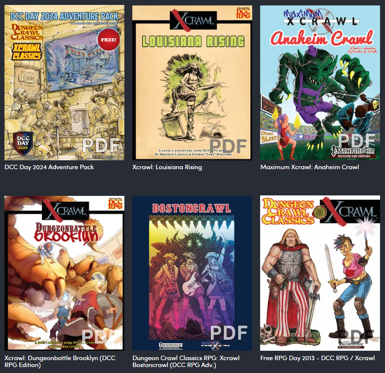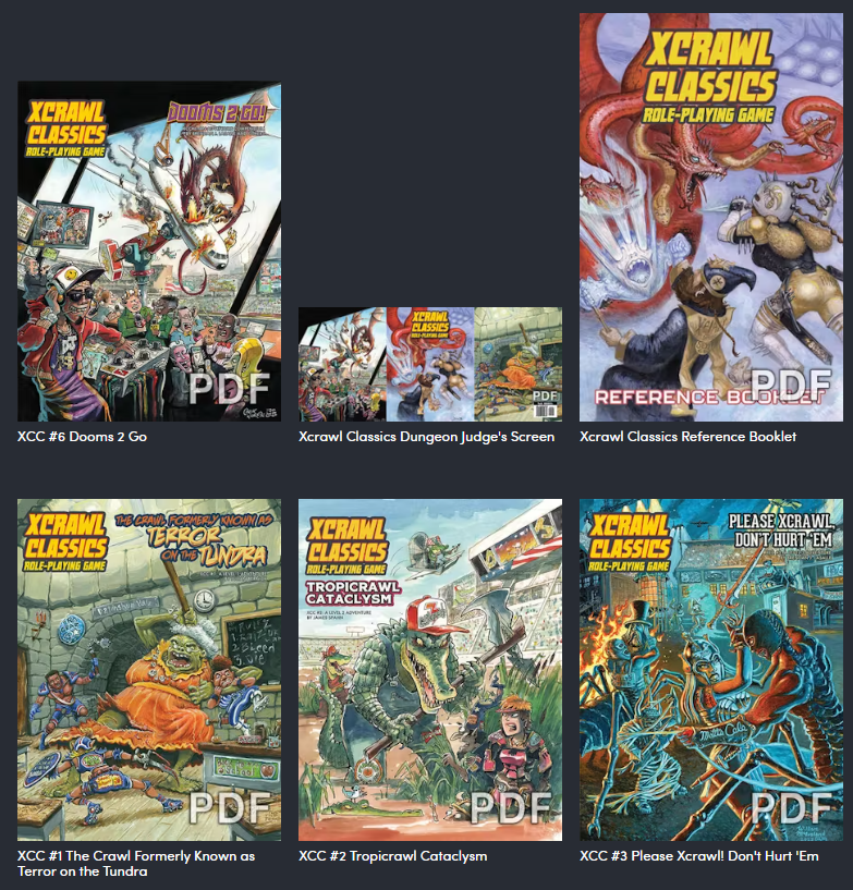 At the highest tier of the second bundle at €36.40, you will get the physical Xcrawl Classics Adventure Assortment. It includes four Xcrawl supplements: three adventures picked at random depending on inventory supply, and issue #1 of the official magazine Xcrawl Insider. As per usual, the price does not include shipping and handling.