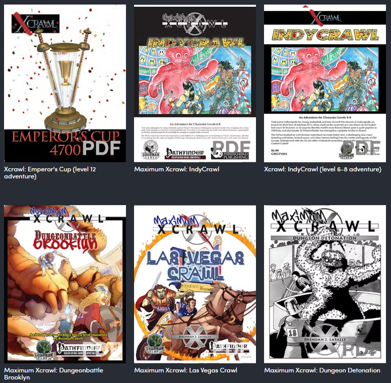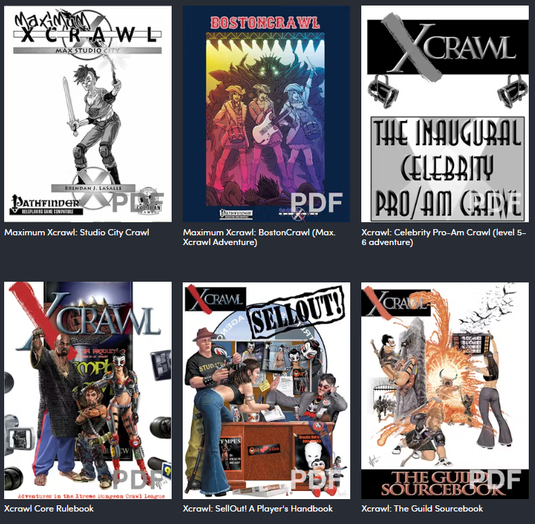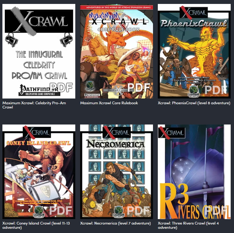 Moving on, the second bundle is the XCrawl Xtreme Dungeon Crawl Superbundle by Goodman Games, which has 45 items. In XCrawl, adventurers are not simple travellers nor heroes, but superstars! It is a complete RPG with new classes, spells and monsters and also unforgettable encounters. I dare say that it’s fantasy meets WWE, as players battle in spectacular dungeons for fame and fortune, and the approval of audiences, of course. Are you tired of fighting the standard goblins and kobolds? Imagine karate dragons and parachuting velociraptors roaming free in your games. Ain’t that cool? Even cooler, XCrawl is compatible with Dungeon Crawl Classics, so you can seamlessly mix material from one into the other.