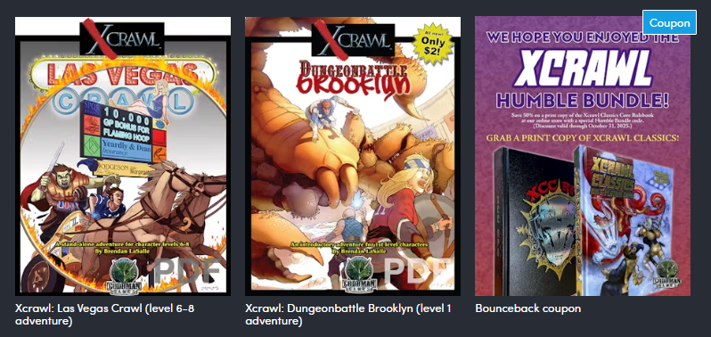 And lastly, a Bounceback coupon is available at the lowest tier at €4.54, to get the Xcrawl Classics Core Rulebook at a great price!