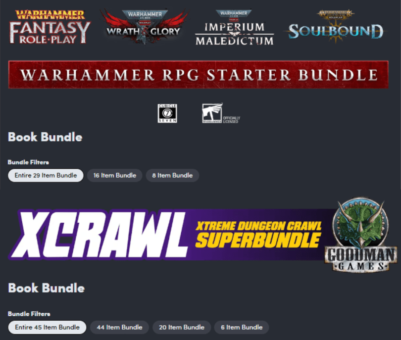 Both bundles are a nice opportunity to expand your collection without breaking the bank. Warhammer RPG Starter Bundle ends around the 11th of October. Currently, the price is €22.74 for everything, while the XCrawl Xtreme Dungeon Crawl Superbundle is at €36.40 and ends around the 9th of October.