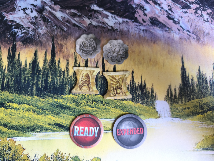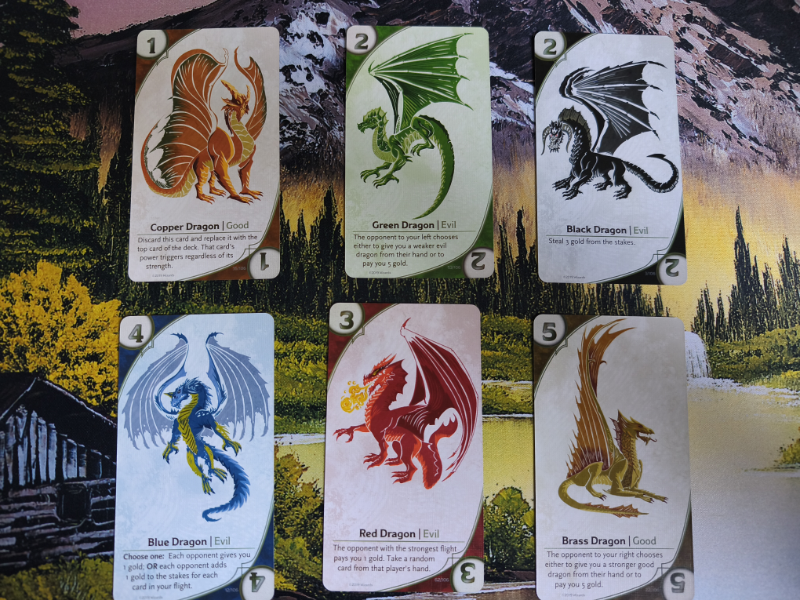 These cards are bigger than the average deck cards, similar to tarot cards. Each card has either a dragon representing a specific colour, which determines the dragon’s alignment, or a mortal, which can be very powerful. At the top right and bottom left corners of the card, you can see the card’s strength, which starts from 1 and goes all the way to 13. At the bottom of the card, there is a short text describing the card’s special power, which varies from drawing and discarding cards to stealing gold or cards, or even altering the result of a gambit, like the druid card, where the player with the weakest flight wins the gambit.