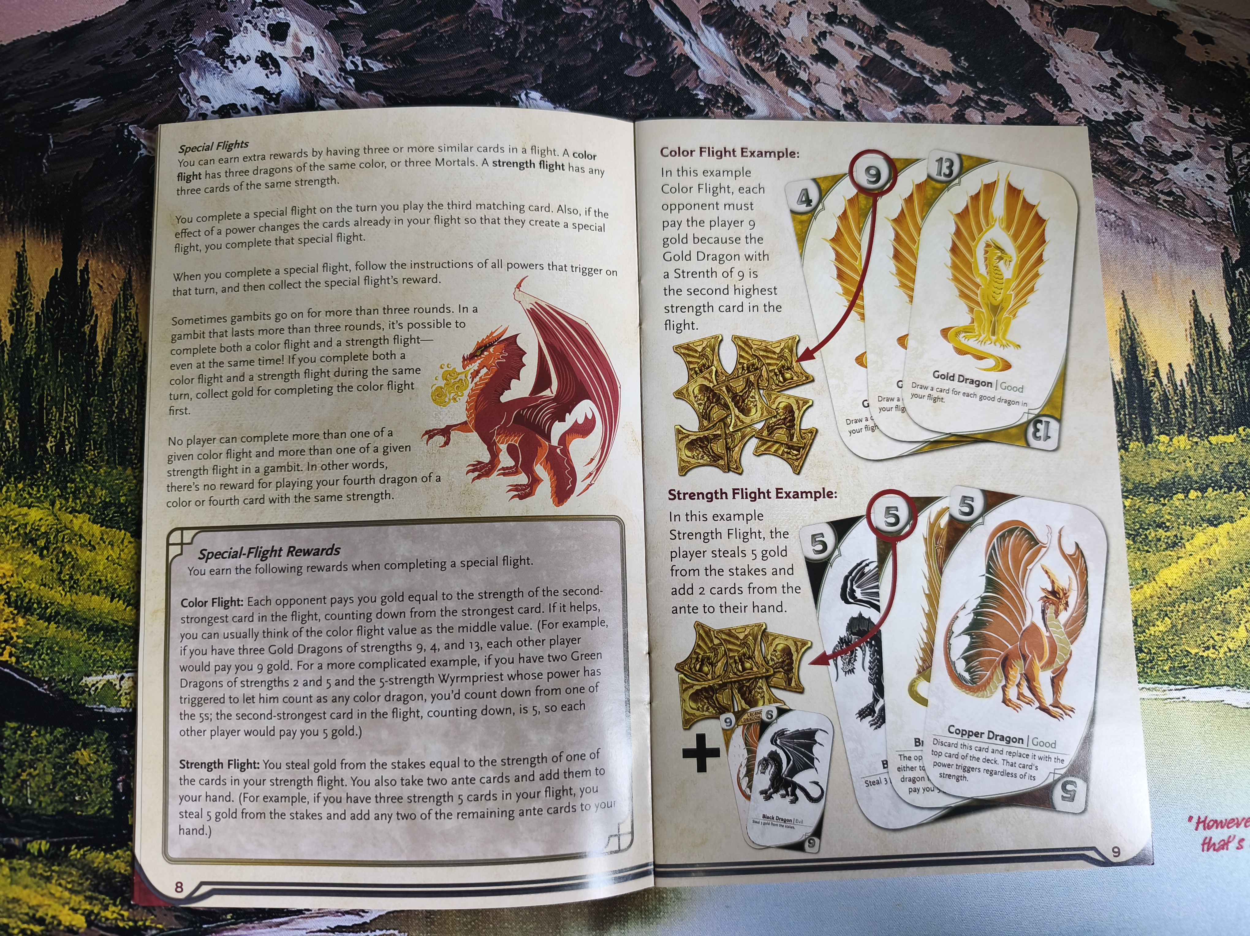 But there’s more! What about legendary dragons? These are special cards with abilities that are always active. There are two types of special flights for those who enjoy collecting: a flight with 3 dragons of the same color, or 3 mortals, is called a color flight and other players pay you money equal to your second strongest card, while 3 cards of the same strength constitute the strength flight and not only you draw 2 cards from the pile but also steal gold from the stakes.