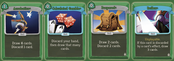 Perhaps the 2 most important cards in this deck are Prepared and Reflex. Prepared is a 0-cost draw+discard, and Reflex is even more draw on its own when discarded; combined, these will be your bread and butter, and in fact are the core of the simplest way for an infinite combo. I won’t elaborate on that as it’s probably going to be the subject of a future post, but you can see how it’s going to work; draw your entire deck into your hand, then cycle through just a couple of free cards over and over.