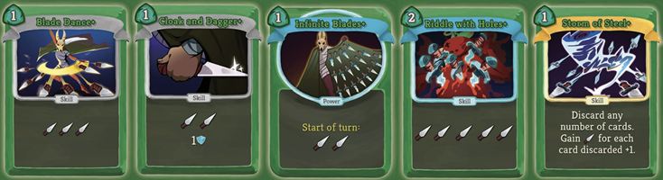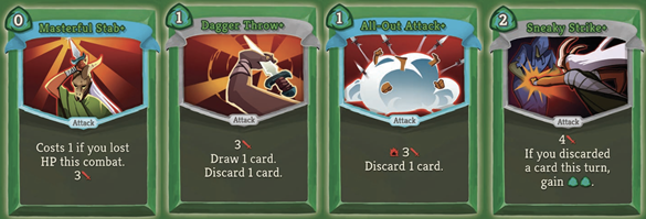 Let’s start with questions 1 & 2, which are usually answered both in each relevant card. Usually, you discard cards to draw more cards. Example: Acrobatics, Calculated Gamble, Prepared etc. Of course, on its own, this isn’t enough to win you a fight, but drawing is always good. There are also some cards which block or damage – you start with Survivor, and there’s also Dagger Throw and Storm of Steel – but the general gameplan here relies mostly on 0-cost (or net-0) attacks. Masterful Stab, Slice (ironically it’s better here than in shivs), Neutralize, and most importantly Sneaky Strike; the goal is to loop through your entire deck several times each turn with cheap, mass draw.
