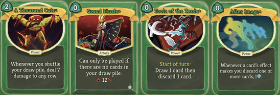 There are several rares that you’re looking for, though none of them are mandatory; the best is After Image, as it helps you stop worrying about block and focus on more draw and damage, but A Thousand Cuts is also a fantastic damage output. Tools of the Trade can fit in any deck, but it shines in discard-focused ones, and of course, I’ve already spoken at length about Adrenaline, Burst, Malaise, and Doppelganger. Finally, there is an honourable mention here, and that’s Grand Finale. Yes, it’s certainly a meme card, especially in the video game, but the board game has a massive advantage that makes it… perhaps sometimes viable? And it’s that there’s no maximum hand size, so you can draw your entire deck into your hand and play this.
