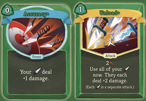 So, how do you scale shivs? Well, the most obvious answer is Strength; however, the Silent doesn’t really have native access to it, so you’ll have to rely on Relics for that. After that, you have 2 options that specifically increase Shiv damage: Accuracy, and Unload. Unload is better with some setup, building up your full stockpile of shivs before using it, but even with just 2-3 it’s a great attack. Finally, we’ve got Envenom; I spoke about it at length in the Poison section, so I won’t get into it again, but it does synergise particularly well with Shivs.