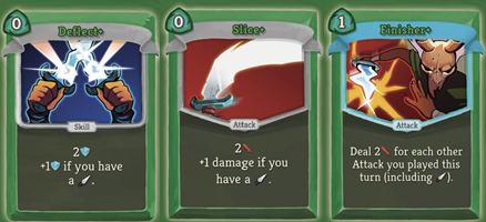 Finally, there are some extra cards that do not generate or buff shivs themselves, but they do have a lot of synergy. First, Deflect; 0 energy for 3 block is pretty good I’d say, so you take this every time. With Footwork, it’s also 5 block instead. Second is Slice. Now this is a bit less interesting; yes, it’s a 0 energy attack for 3 damage, but you’ve already got enough attacks from the Shivs themselves – I actually don’t think you pick this up most of the time. Finally, we’ve got Finisher, which is a great payoff for all your shivs; with the max 5 it’s 10 damage on its own, and you can easily play more than that. It also scales great with Strength if you manage to get some!