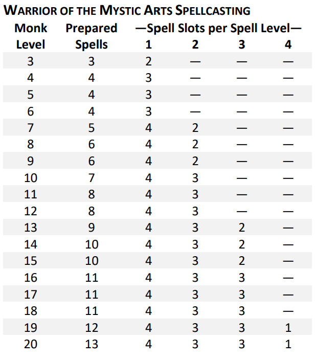 This is a spellcaster Monk – but without spending Ki (or Focus) points for casting like the Way of the FOur Elements did in 5e. This is a normal spellcaster with spell slots. And speaking of –