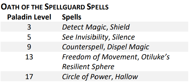 Your extra prepared spells. Expected stuff – Detect Magic, Dispel Magic, Counterspell, et cetera et cetera. Not much else to say here.