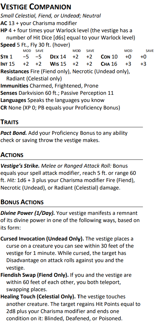 Finally, we have a warlock subclass, where your patron is a vestige of a dying or forgotten god.