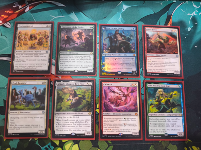 Finally, I have five notable mentions. Hovel Hurler, Flock Impostor, Abigale, Eloquent First-Year, Tam, Mindful First-Year, and Champions of the Perfect were pretty good cards for the deck. Technically, I cannot say how good the Champions of the Perfect were because they would be instantly dealt with the moment they would drop on the board. Flock Impostor basically would double an ETB effect, or save something from being targeted with a spell. A mistake I made with it, however, was that I forgot it had flying. It’s funny because it has a bunch of rows of text, so I kinda skipped the flying part. That mistake cost me a win. Tam, Mindful First-Year was an interesting card. It acted mostly defensively. I did use its ability once or twice, but I think it made some players a bit hesitant in a couple of matches, which gave me a couple of extra turns to do my thing. Mind games, people. They work in Magic.