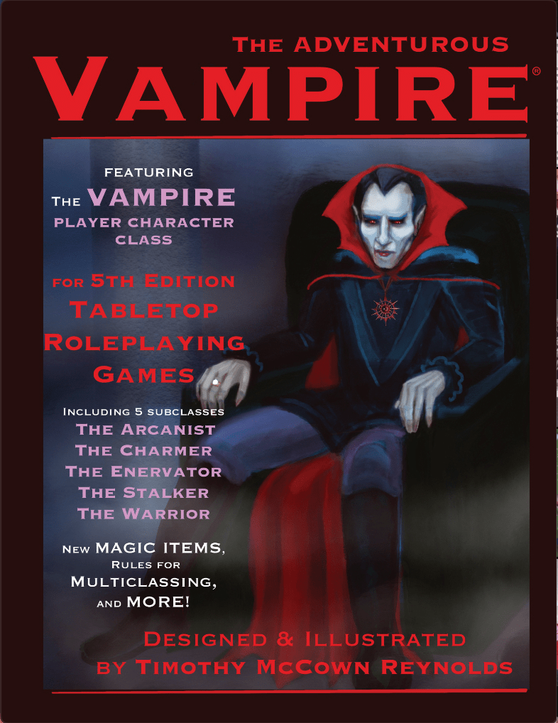The Adventurous Vampire is a D&D 5e supplement about the vampire class by Midnight Moth Publications. It provides all you need to create a playable vampire character.