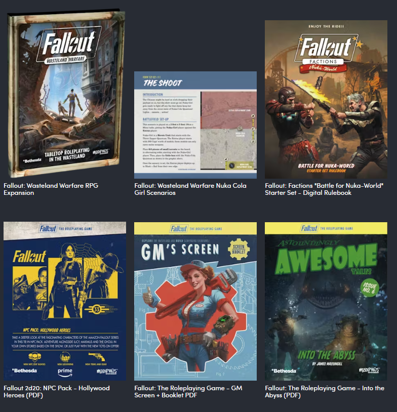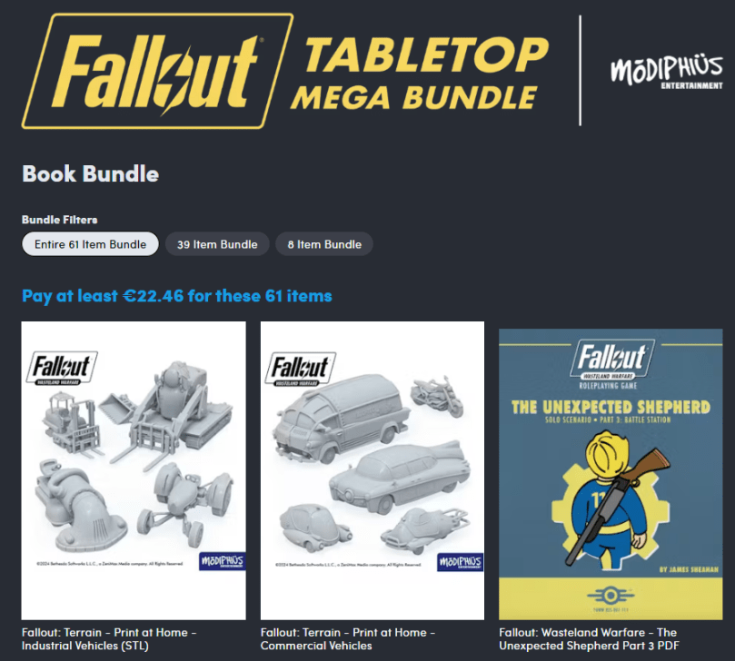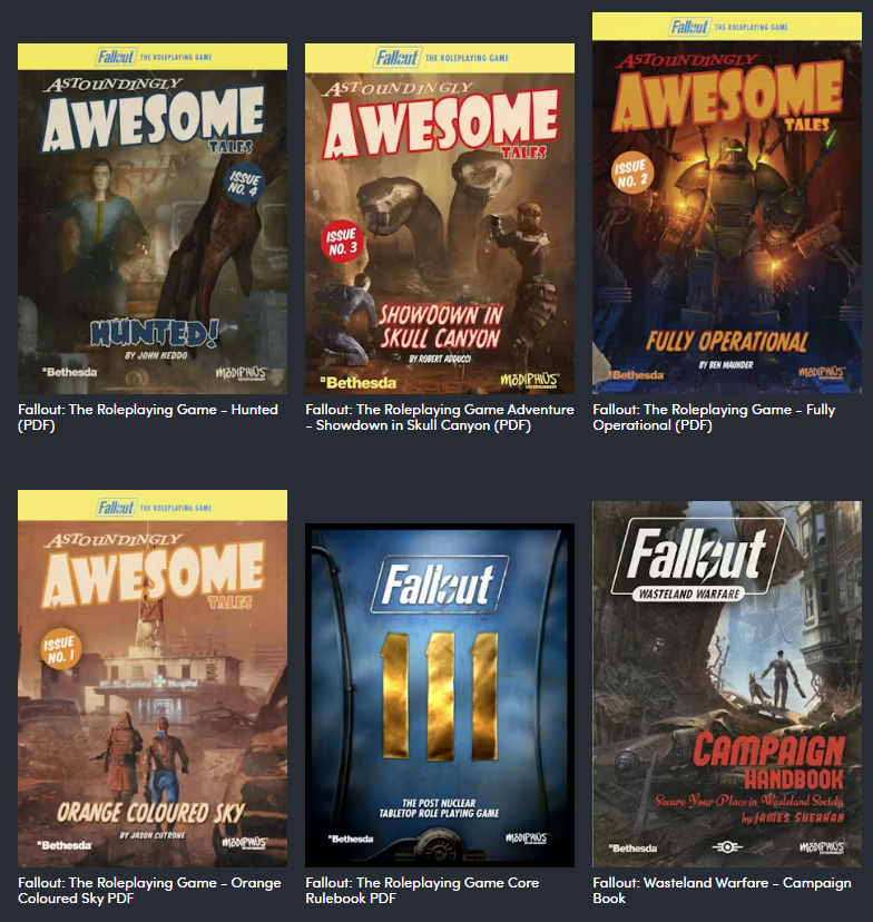 Fallout Tabletop Mega Bundle is indeed a mega bundle as it contains 61 items for fans of the Fallout universe, and not only! It is designed to aid both players and game masters, as it includes books filled with rules, stats and tools, rich lore and also guidance to elevate your gaming table.