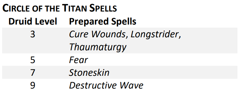 I’m not sure what sorts of spells would make sense to have here. You could have lots of things, but this list looks alright. You could also include something like Enhance Ability or Enlarge/Reduce, but that last one especially might be a bit of an overkill – because this isn’t just the usual “you have these spells prepared” feature that most casters get: these spells are also available to you while you are in your Titan Form, which is an alternate form of Wild Shape and thus normally doesn’t allow spellcasting.