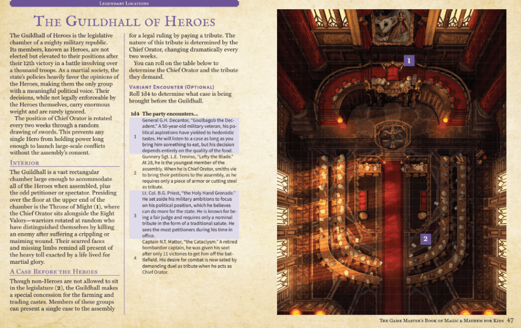 This book is not just another adventure, but a wide range of tools to inspire storytelling and worldbuilding for young game masters. On the very first pages of it, you are greeted by an introduction that explains its purpose. The way it is presented is through an overview of what the book is and what it is not, adding another nice touch that takes into consideration how kids think. And even if you couldn’t plan a session for whatever reason (that we will definitely not judge, truly), the book offers an action-packed one-shot adventure involving pirates and treasures. The adventure isn’t restricting in any way and involves reaching out to the players during the setup. Feel free to choose your elements, mix them together and craft your own unforgettable story. Does Jolly Dodger ring a bell?